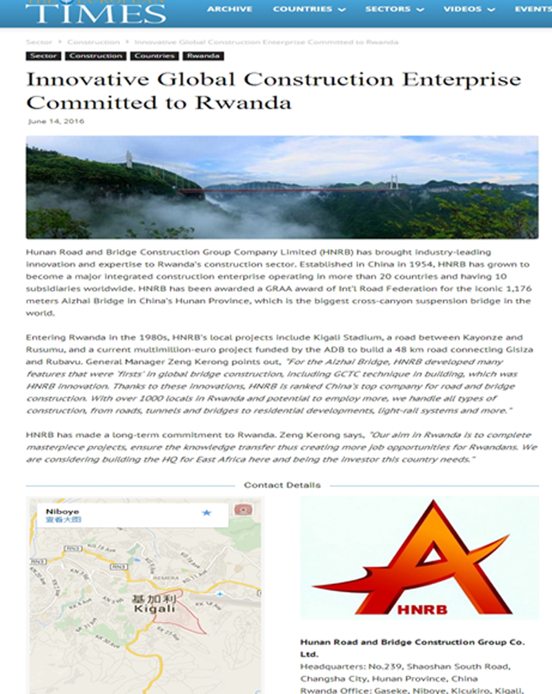 6月14日,歐洲最大的華文日報《歐洲時報》以《創(chuàng)新的全球性建筑企業(yè)投身盧旺達(dá)》為題,積極報道我“湖南路橋”。文章介紹了集團(tuán)基本情況、矮寨大橋的創(chuàng)新及在盧旺達(dá)的施工業(yè)績等。這將有效幫助集團(tuán)提升國際地位和國際知名度。