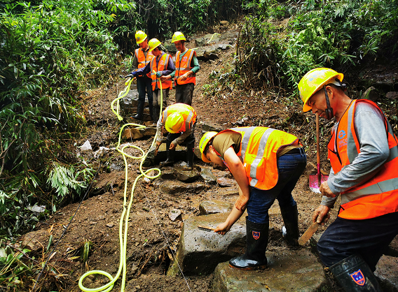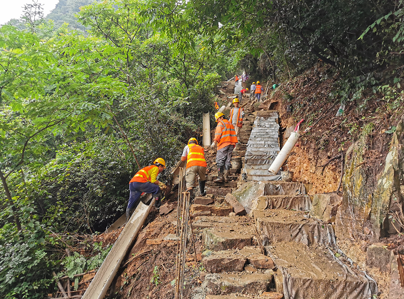 工人穿著厚重的雨衣、雨靴,趴在陡峭的山道上施工,每天一身泥、一身土、一身汗。普通人爬一趟要一個半小時的山路,有的工人一天要來回爬上五六趟。為保證安全,在施工前,攻堅(jiān)小組先帶人將石板路全部刷了一遍,以減少滑倒,后又在有條件的地方搭起了雨棚。