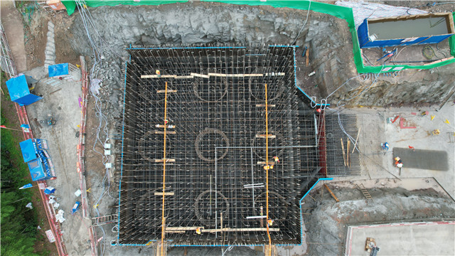 6月17日,官莊岸索塔左幅承臺(tái)首層混凝土澆筑